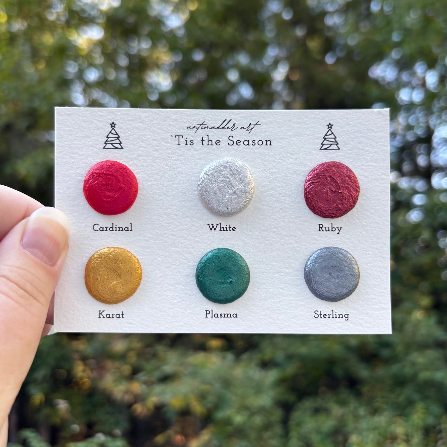 A collection of six shimmery watercolors in Christmas colors.