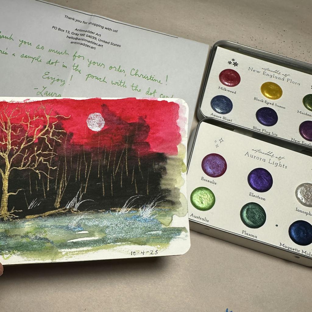 Ingredients: Micas, distilled water, gum arabic, vegetable glycerin, and clove leaf oil. The dots come on a 4.5x3 inch piece of cellulose watercolor paper.