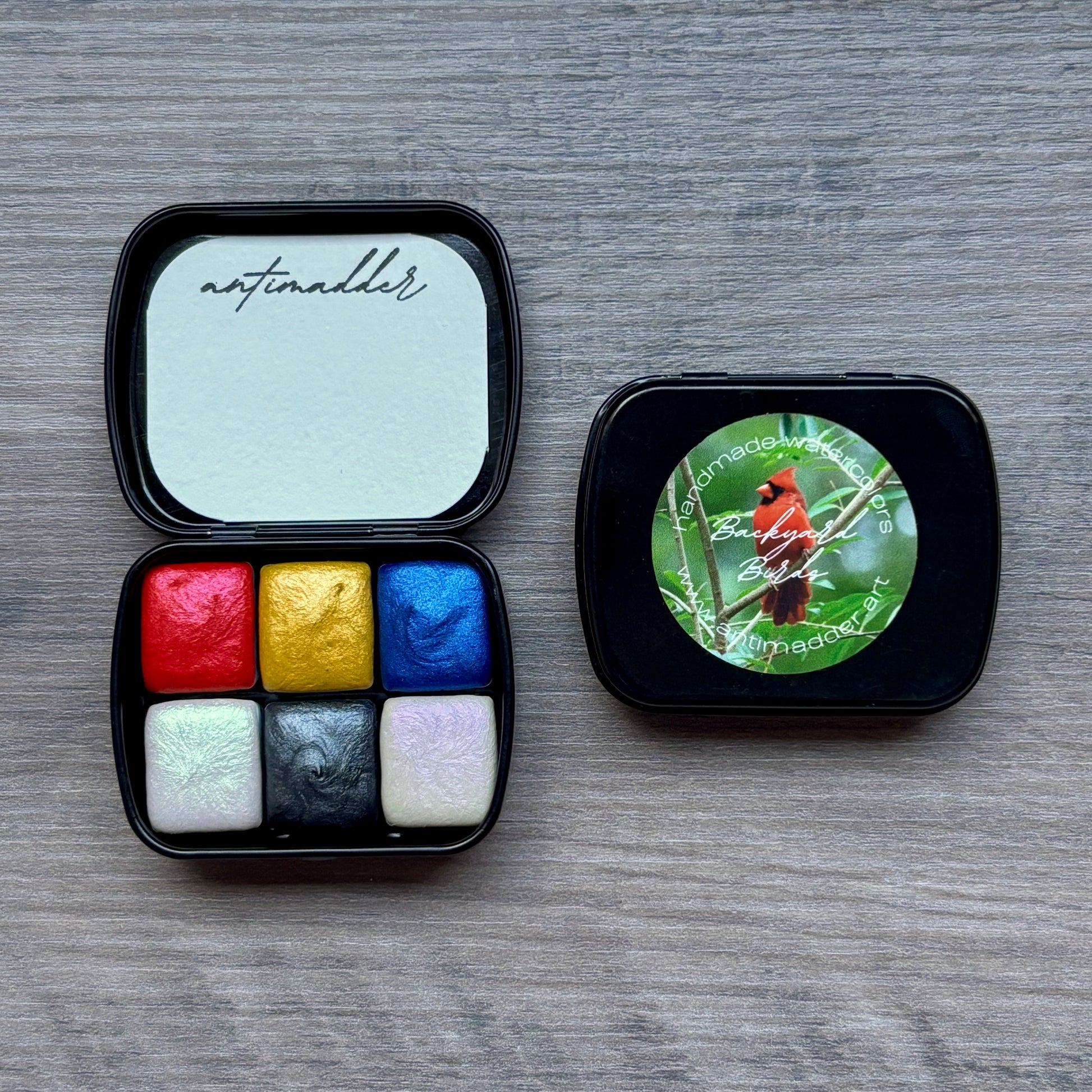 Backyard Birds is a set of six handmade, mica watercolors inspired by the colors and iridescence of local birds. It's available in quarter pans and half pans.
