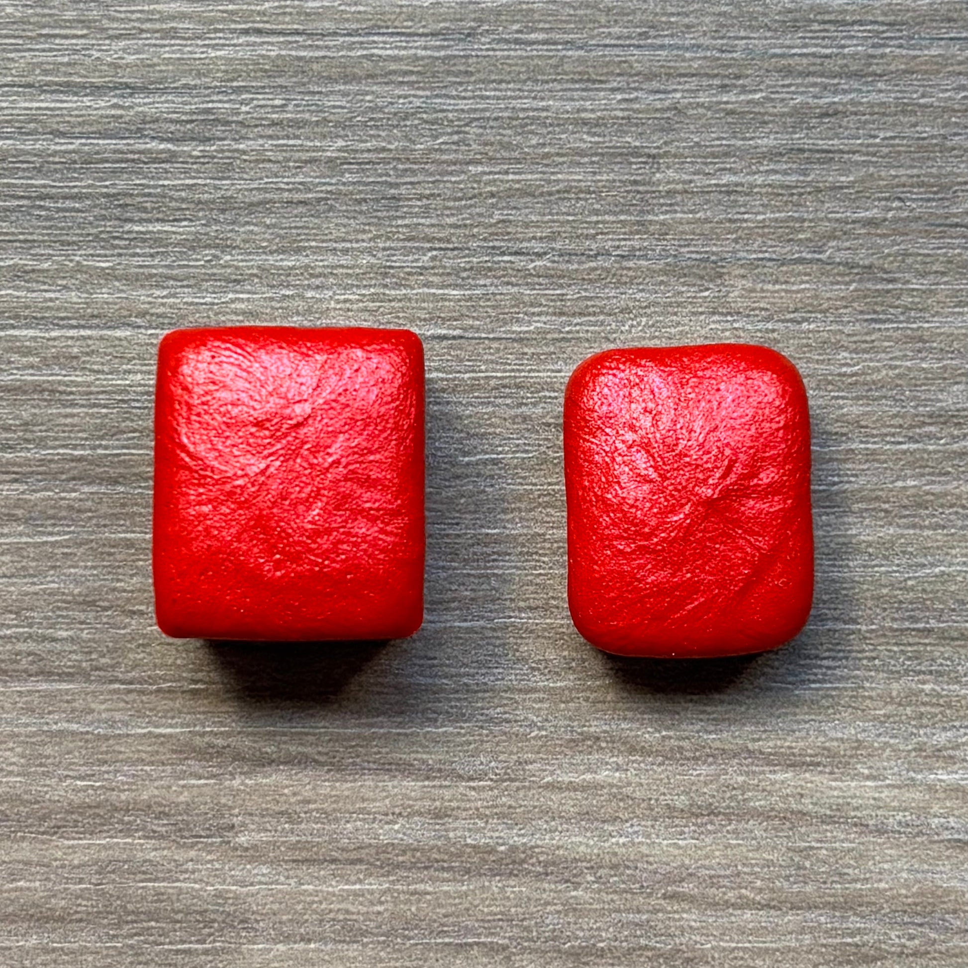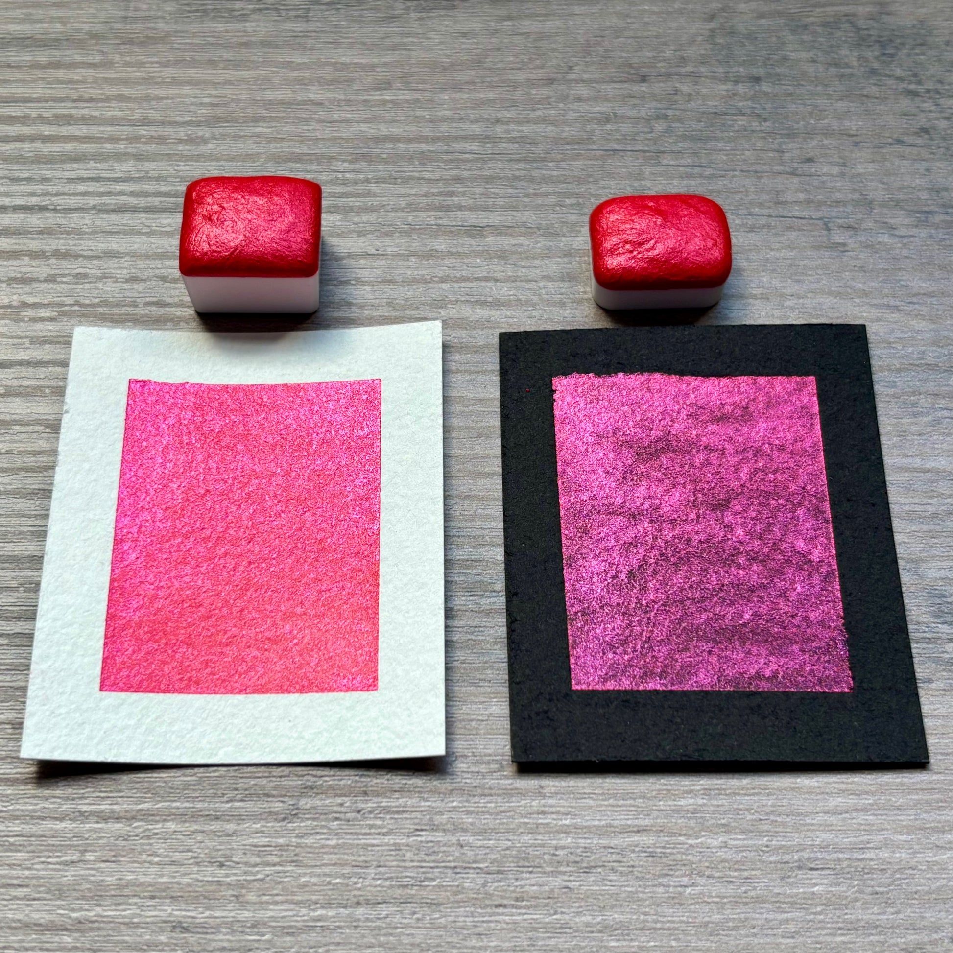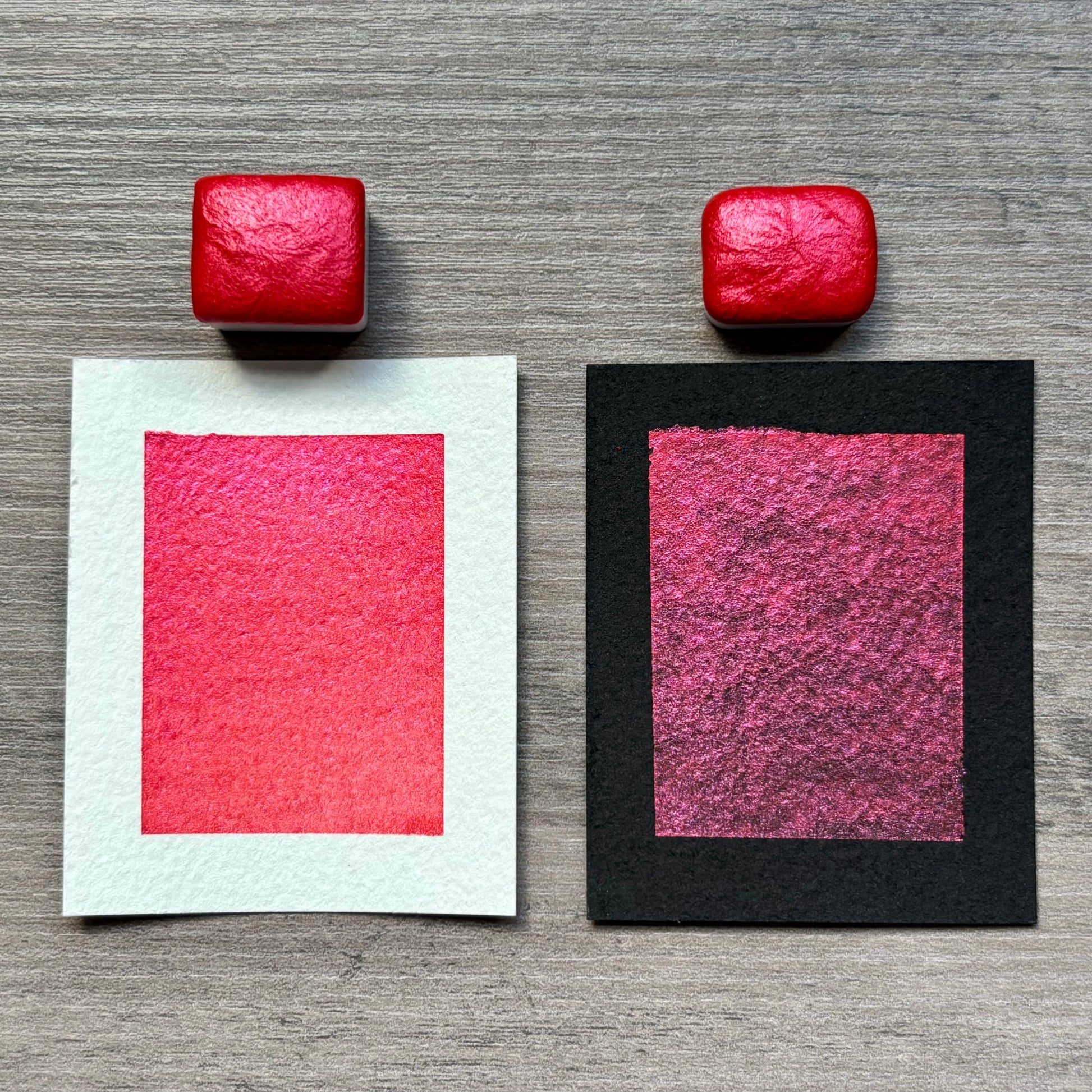 Cardinal is a shimmery red watercolor paint. Unlike many red micas, its color comes from iron oxide pigment, not dye, making it lightfast.
