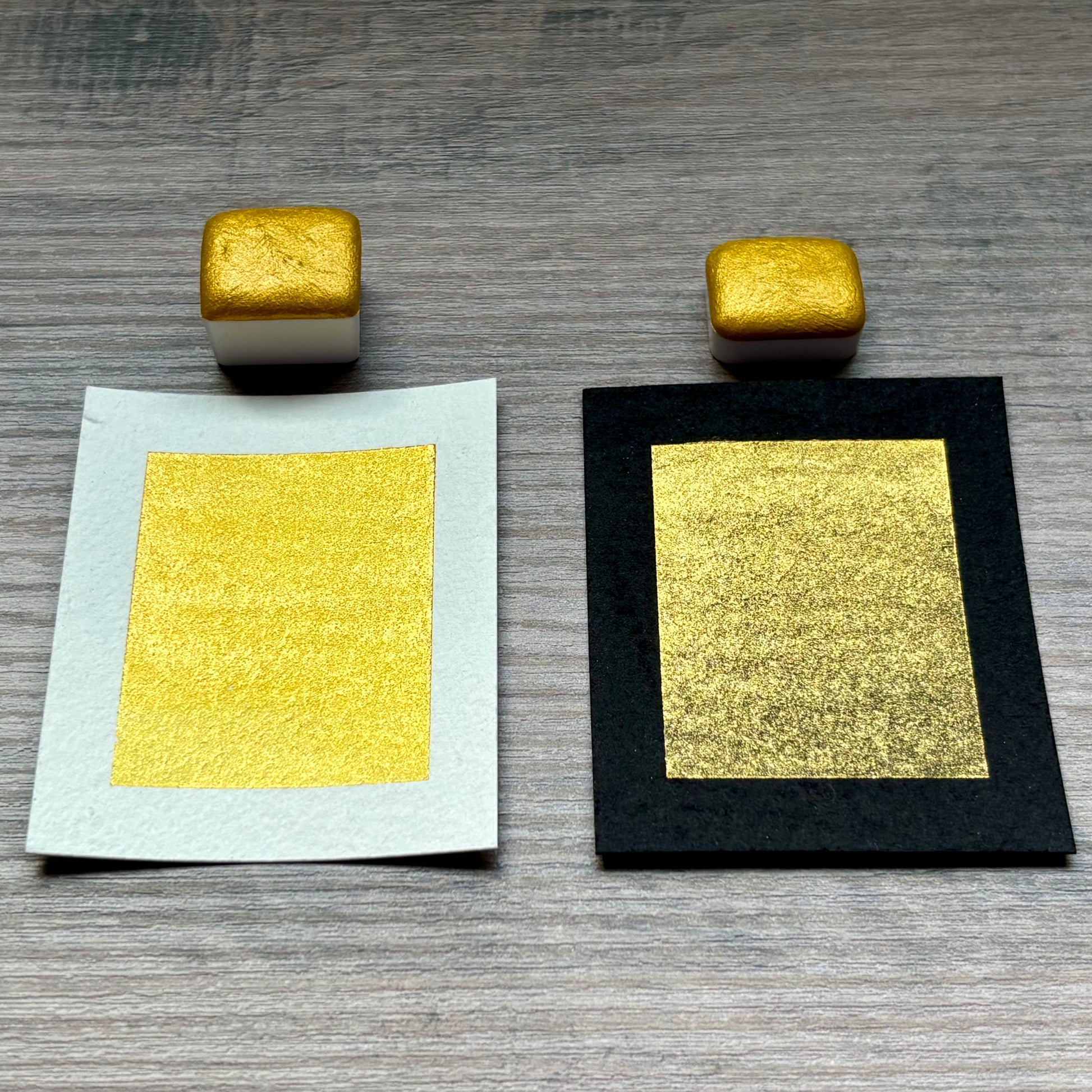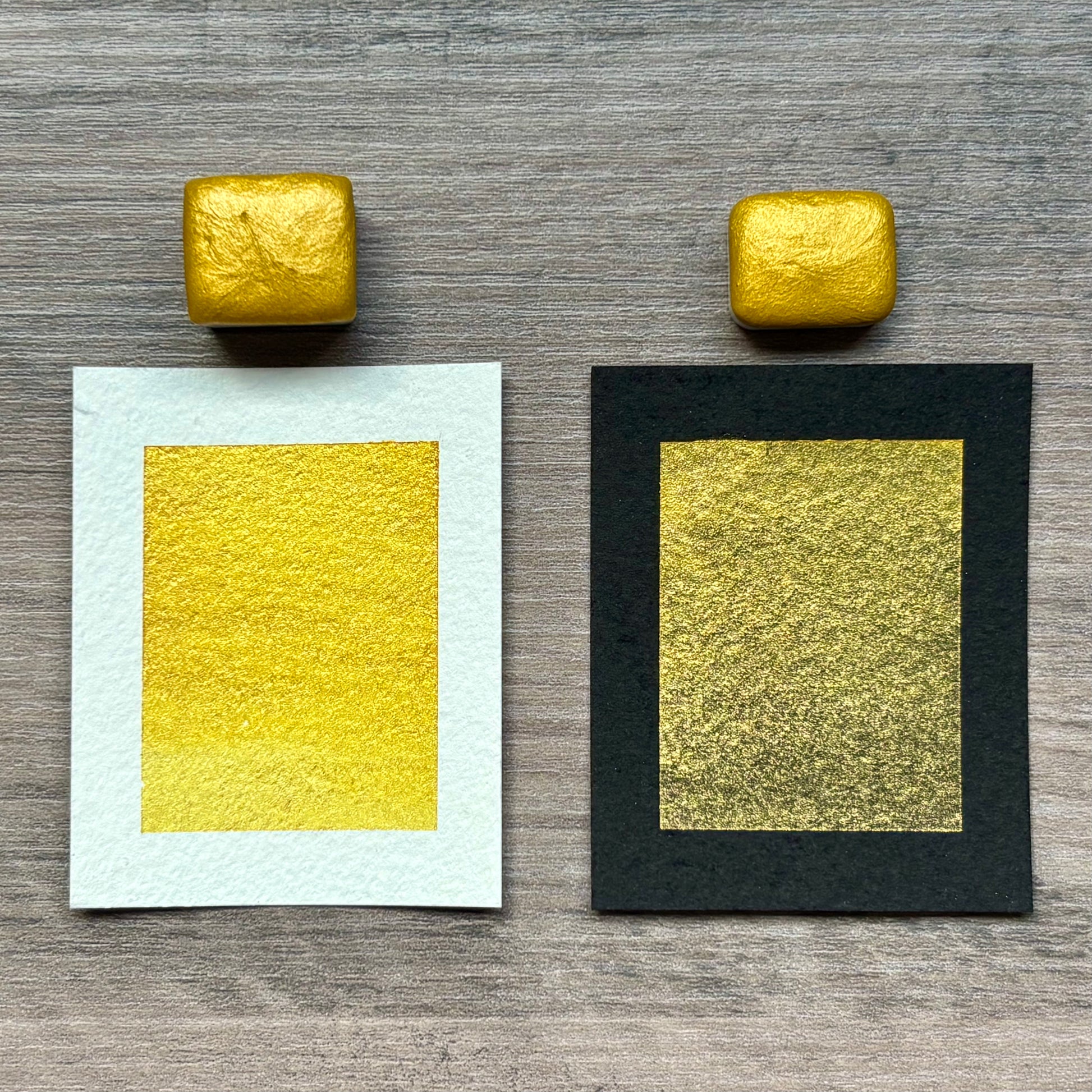 Goldfinch is a shimmery, deep yellow watercolor paint. It's deeper and more golden than Black-Eyed Susan, but more yellow than Karat.