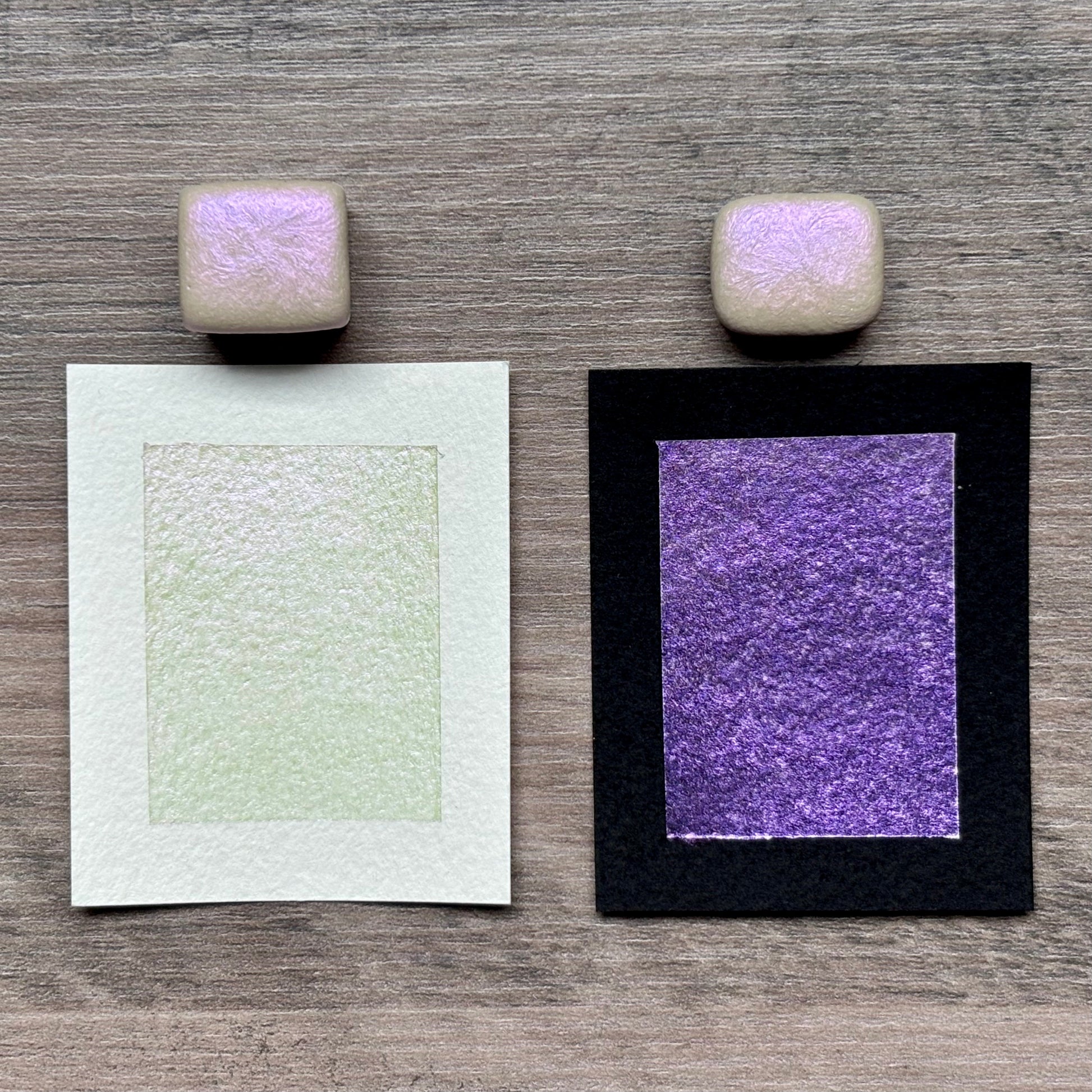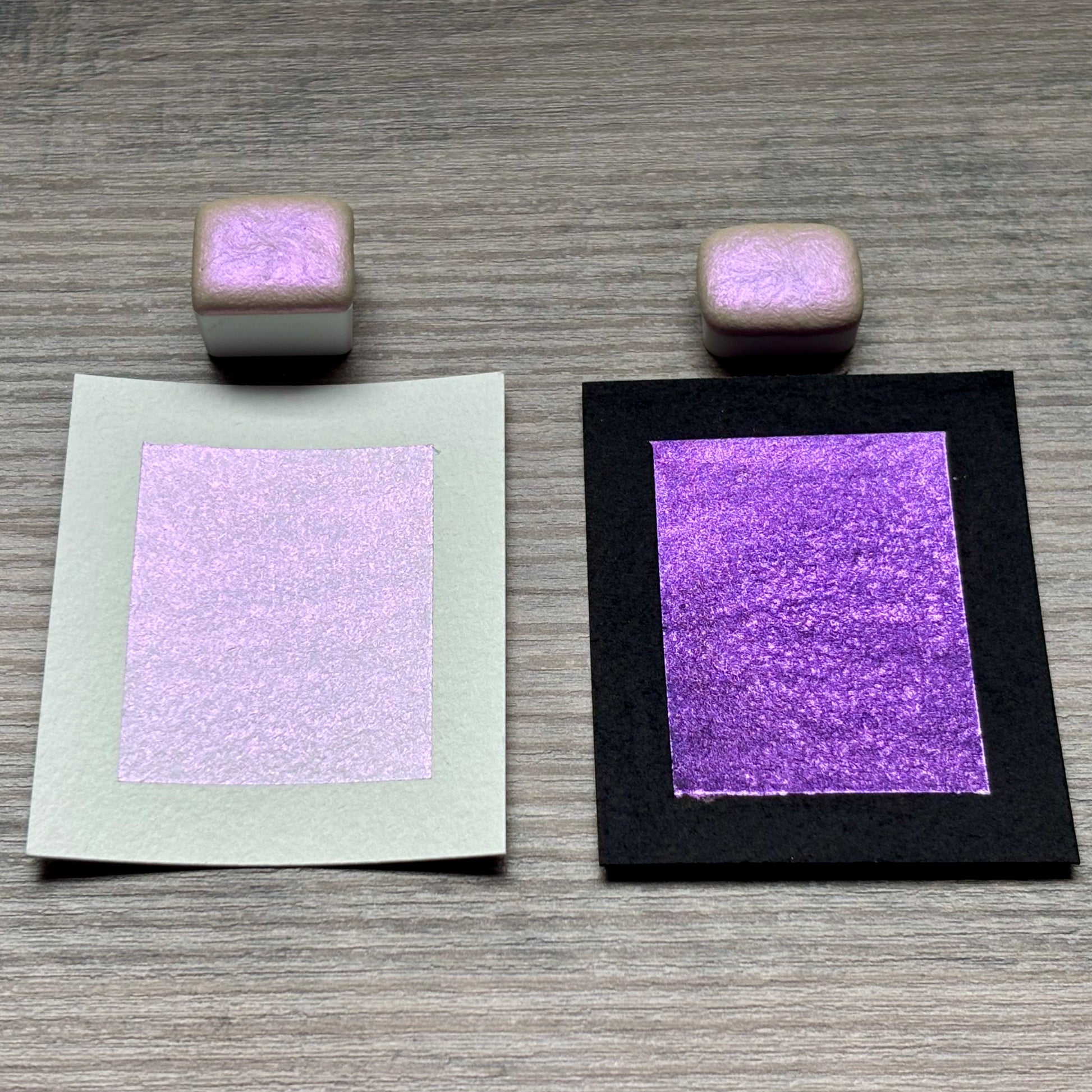 Grackle is a shimmery interference purple watercolor paint. Interference colors look off-white from some angles, and bright and glowy from others. They also look great on black watercolor paper, or mixed in/layered over dark watercolors.