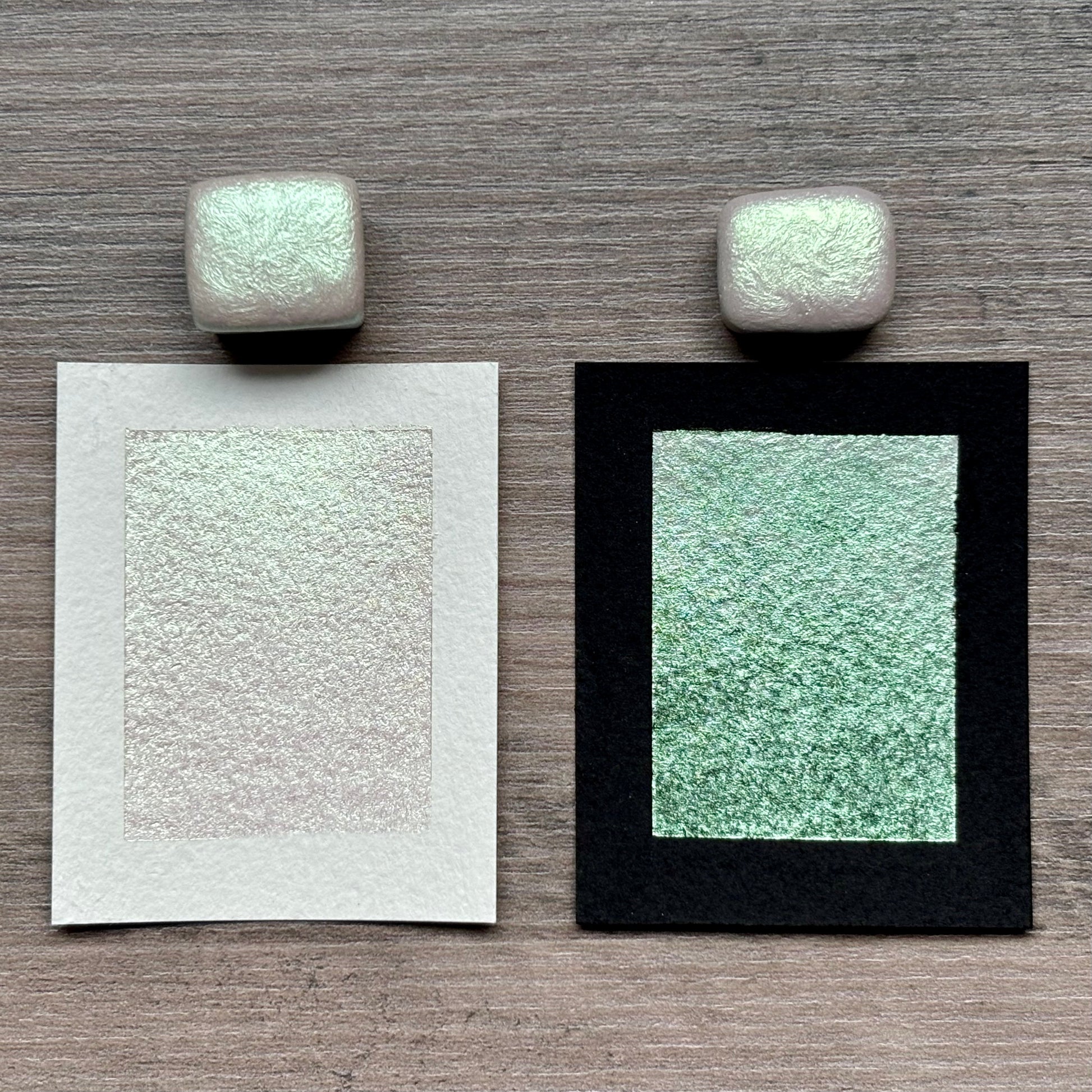 Hummingbird is a shimmery interference green watercolor paint. Interference colors look off-white from some angles, and bright and glowy from others. They also look great on black watercolor paper, or mixed in/layered on top of dark watercolors.
