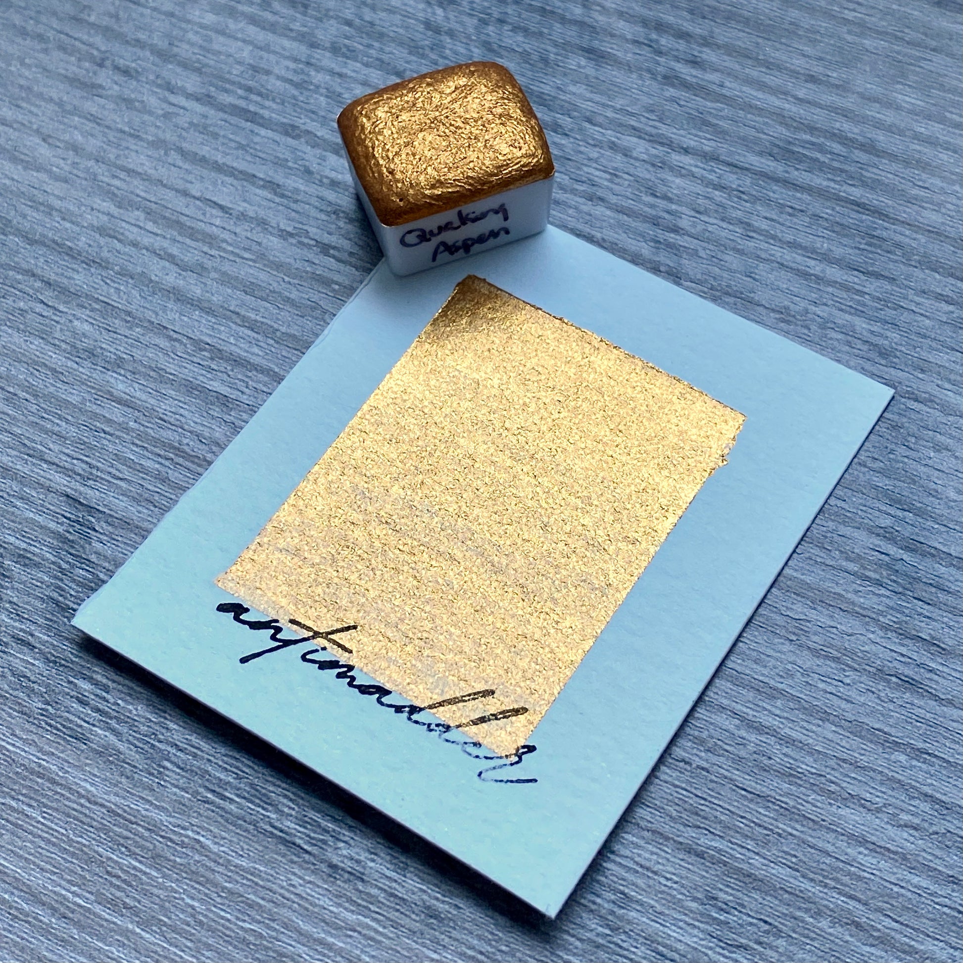 Quaking Aspen is a sparkly yellow gold watercolor paint. Compared to Karat, Quaking Aspen leans slightly browner.